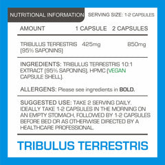 Tribulus Terrestris 10:1 Extract (95% Saponins), HPMC Vegan Capsule, NO Fillers, NO Binders, NO Caking Agents, NO Magnesium Stearate.