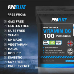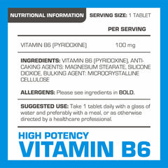 Warning: Vitamin B6 Tablets is a food supplements and should be used as a part of a varied and balance diet. Do not exceed the recommended dose unless advised by a physician. Store out of the reach of children.