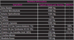 Citrulline Malate, Creatine Monohydrate, Beta-Alanine, Betaine Hydrochloride, Acid (Citric Acid), N-acetyl L-tyrosine, Acidity Regulator (Sodium Bicarbonate), Flavour, Vitamin C, Caffeine, Sweetener (Sucralose), Colour (Copper Chlorophyll), (Vitamin B6, Piperine, Vitamin B12 (as Cyanocobalamin).