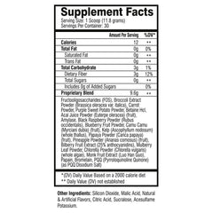 Fructooligosaccharides (FOS), Broccoli Extract Powder (Brassica oleracea var. italica), Carrot Powder, Purple Sweet Potato Powder, Betaine HCl, Acai Juice Powder (Euterpe oleracea) (fruit), Amylase, Black Raspberry Powder (Rubus occidentalis), Blueberry Fruit Powder, Camu Camu (Myrciani dubia) (fruit), Kelp (Ascophyllum nodosum) (whole thallus), Papaya Powder (Carica papaya) (fruit), Pineapple Powder (Ananas comosus) (fruit), Bilberry Fruit Extract (25% anthocyanidins), Mulberry Leaf Powder, Chlorella Powder (Chlorella vulgaris) (whole algae), Monk Fruit Extract (Luo Han Guo), Papain, Bromelain, PQQ (Pyrroloquinoline Quinone)(as PQQ Disodium Salt).