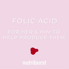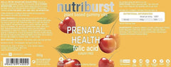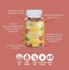 NEW & IMPROVED - based on your feedback, we have amended the level of folic acid in our gummies to match that of nhs guidelines.If you want to get pregnant, the NHS recommends taking a daily folic acid supplement. You need to continue taking it during the first 12 weeks of pregnancy, when your baby's spine is developing. Folate and folic acid helps your body form healthy red blood cells, and it's found in foods like spinach, broccoli, chickpeas, brown rice and granary bread. It's a good idea to eat plenty of these foods during your pregnancy but, advises the NHS, "It would be almost impossible to get enough folic acid just from food. The only way to be sure you're getting the right amount is by taking a supplement."Enter nutriburst prenatal vitamins. Our folic gummies are chewy, delicious and naturally flavoured with cherry, these supplements are easy to take and seriously tasty. Because when you've got morning sickness that lasts the whole day, the last thing you need is to try and swallow a giant smelly pill, right? So right. It is up to you (and based on the advice from your doctor) as to whether you want to take one or two gummies - putting you in control. One more thing: you're going to be an amazing mum.Reassurance: You're giving your baby the best possible protection against spinal defects like spina bifida and anencephaly. Quality: All our vitamins have been made to the highest quality and have been independently lab tested. Our manufacturing facility is BRC approved.Vegan FriendlySugar-FreeHalal SuitableNon-GMOCruelty-FreeGluten-FreeNo Artificial Flavour