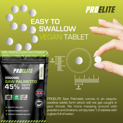 PROELITE Saw Palmetto is a high-strength potency with a 20:1 extract ratio providing 3000mg of active Saw Palmetto in an easy-to-swallow one vegan tablet per day formula.