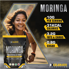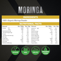Moringa is high in iron that contributes to normal cognitive and immune system function. Iron helps reduce tiredness and fatigue and promotes the normal transport of oxygen in the body. High in fibre, source of vitamins A and vitamins C. Moringa is a source of calcium, which helps maintain normal muscle function, calcium is also necessary for the maintenance of normal teeth and bones.