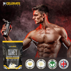 XCelerate's Whey+ new protein blend has the fast acting properties of a whey protein with the increased amounts of arginine in the pea protein to help with your muscle building goals alongside the slow releasing micellar casein in milk protein to aid in your recovery.